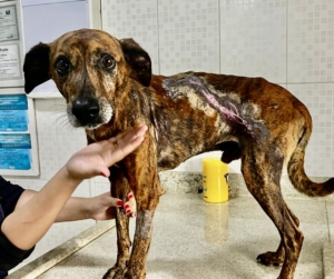 Paçoca foi queimado com água fervente por pura maldade. Porte médio pequeno, castrado e vacinado. Dócil